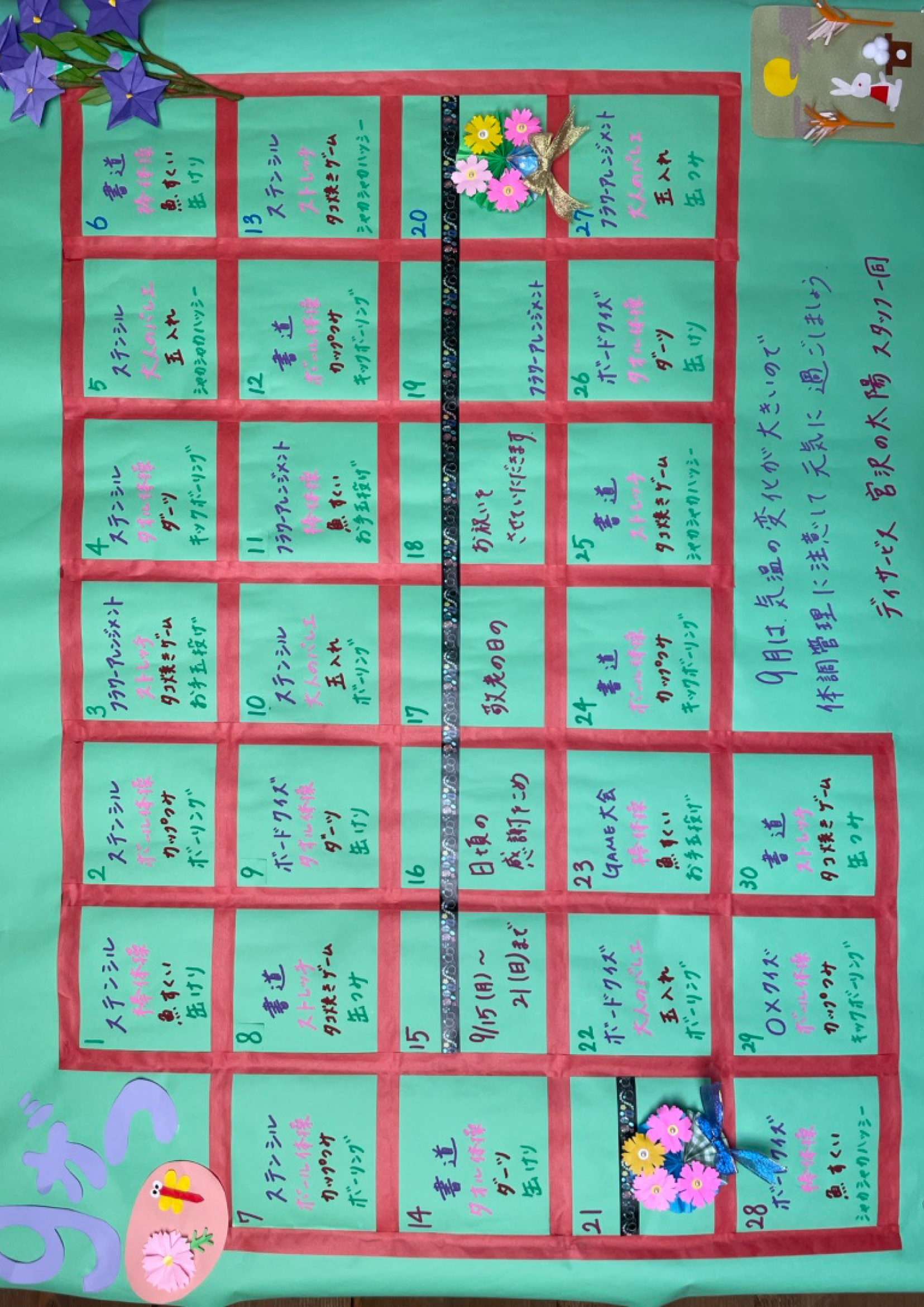 まだまだ暑さが続きます。体調に気をつけながら、来月も元気に過ごしましょう。